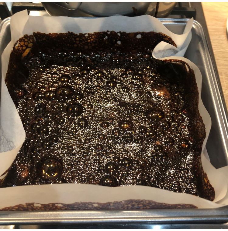 So what happened I hear you ask… well let me start by offering some good grounded advice, read the recipe properly, get the ingredients together and then FOLLOW the recipe. I thought I did but quite clearly did not. In my defence I was daydreaming of winning the Great British Bake off by making the most spectacular honeycomb that Paul Hollywood would be proud of. However, this was probably not the best thing to be daydreaming off as I boil 500g of sugar to the boiling point of 150 degrees. This really was a disaster waiting to happen. The whole pan was black, I burnt the sugar and honey but thought maybe I should just add the bicarbonate of soda just in case by some miracle the soda would change the colour and make it all ok and turn into the golden nuggets I was anticipating. But it didn’t change anything apart from making it easier to remove from the pan by pouring it into the baking tray to what resembled more like coal.