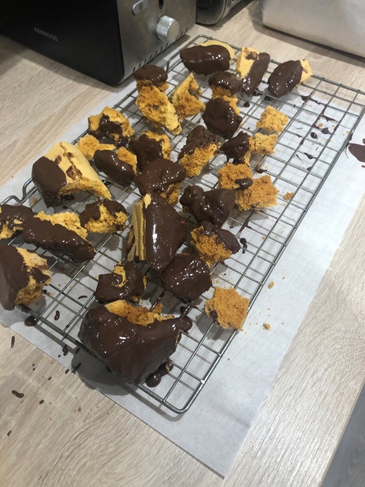 - Once the honeycomb has cooled, snap it into little bitesize pieces and cover in melted chocolate. For the melted chocolate, break the pieces up in a microwavable bowl, ping in the microwave until the chocolate is melted and dip the honeycomb into the bowl and then place in the cooling wire rack for the chocolate to set.