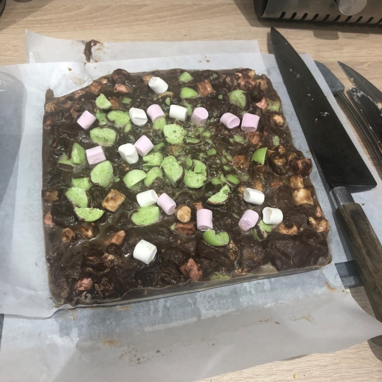 - Top the mixture with the remainder of the marshmallows and Rolo’s and put in the fridge to chill for a couple of hours. (I was a bit sparse with the marshmallows and Rolo’s the last time for the topping so throw as much of the marshmallows and Rolo’s as you want on top).